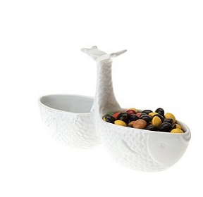 To serve small snacks, such as nuts and pretzels, check out this dual goldfish serving dish. Fill it with your favorite candy, or put dip on one side and crackers in the other, for a fun and simple platter.